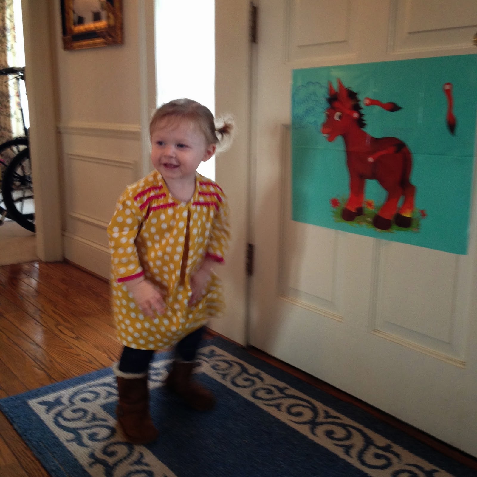 She debuted it at Thanksgiving this year, and can you believe that she did not stand still even ONCE for me to get a great picture of her in it?!?! (I can! ;)